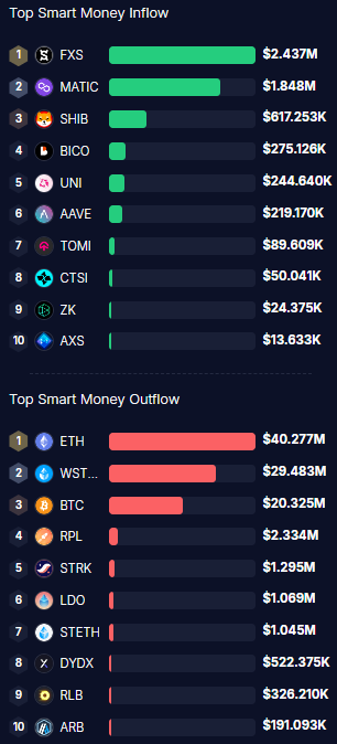 Smart money flows: $FXS, $MATIC, $SHIB, $BICO and $UNI leading inflows, while $ETH, $WSTETH, $BTC, $RPL and $STRK leading outflows