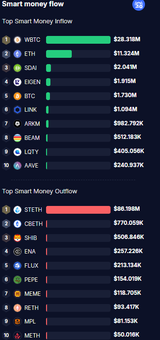 Smart money flows: $WBTC, $ETH, $SDAI, $EIGEN and $BTC leading inflows, while $STETH, $CBETH, $SHIB, $ENA and FLUX 0.00%↑ leading outflows